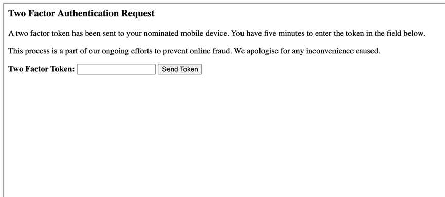 <p>A two factor token has been sent to your nominated mobile device. You have five minutes to enter the token in the field below.</p>