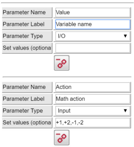 Input parameters to a rule set can be constants (in quotes), a variable or a value from a drop-down list. To make the input parameter a drop-down list, supply a CSV list of values in the Set values field.