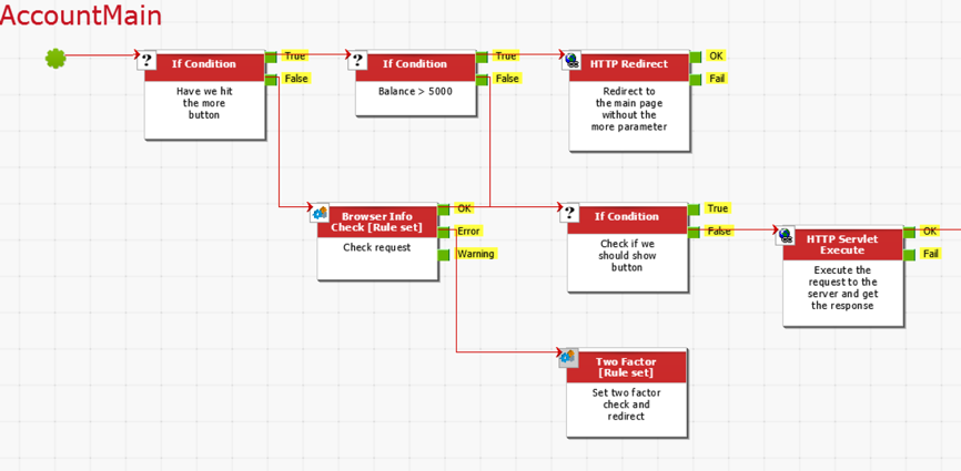 The BrowserInfoCheck rule set as part of the Qwerty, AccountMain rule set is behaving just like any other rule. This was done by dragging it from the Rule Sets folder in the editor and onto the editor canvas. The key to making this approach work is to use Rule Set Exit rules in the embedded document. The rule set exit rules in any given rule set determine what chain points will be available for that rule set when it is embedded into another page.