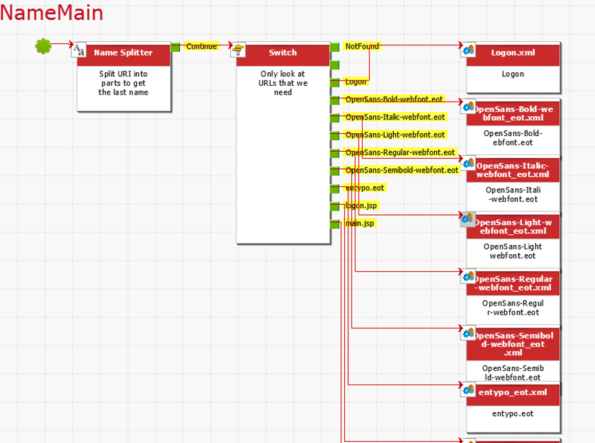 The main rule set page contains a basic structure that determines the URI being visited and then uses a switch to re-direct to a rule set covering that URI.