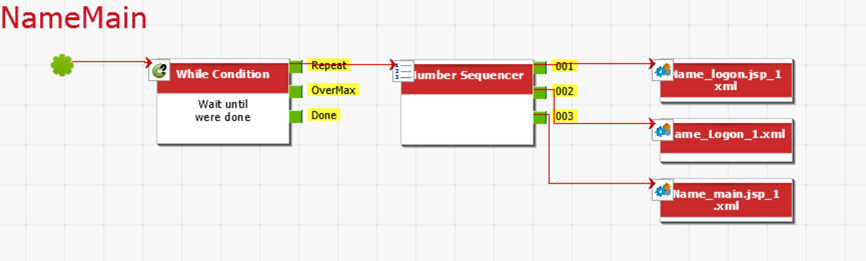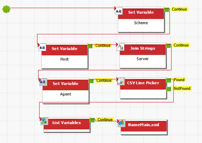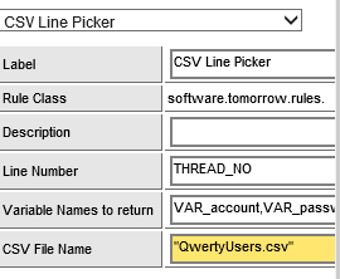 In this scenario, the users and their passwords are picked from a CSV file of valid entries. The settings for the CSV Line Picker rule are as follows:
