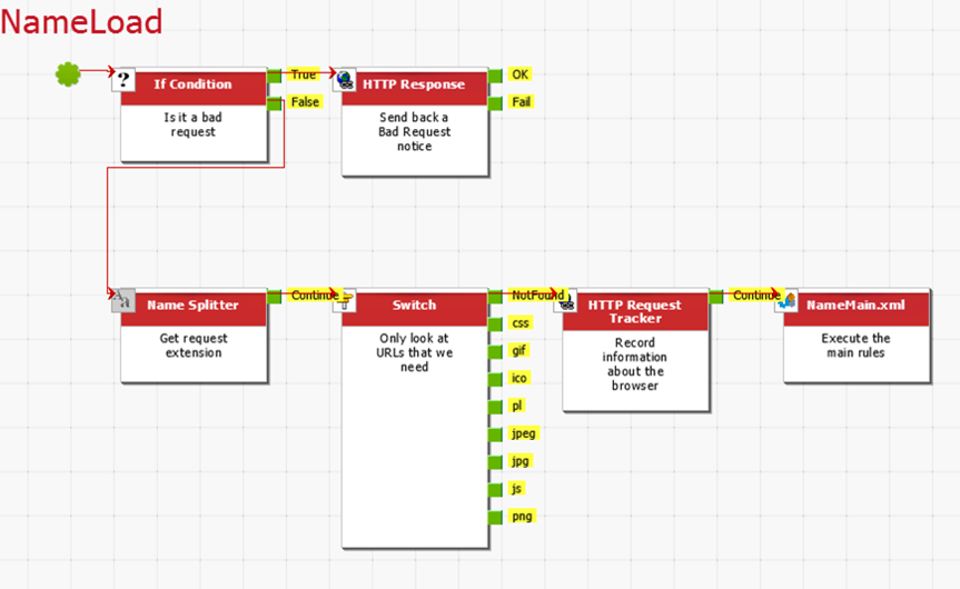 This rule set will first check for malformed HTTP requests and, if found, will reject them. Subsequently it filters out static content, adds a tracker rule and then proceeds to the main rule set.