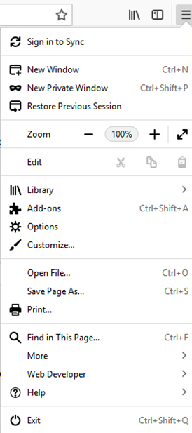 <figure><img src="https://2423451286-files.gitbook.io/~/files/v0/b/gitbook-x-prod.appspot.com/o/spaces%2F42mDa58RoaDxb6t8mbaI%2Fuploads%2Fgit-blob-a24eb7c0d7231a4649b796dbfd5530a3452a8723%2Fimage.png?alt=media" alt=""><figcaption><p>Firefox Quantum menu</p></figcaption></figure>