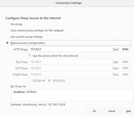 Depending on the type of web browser being used, you should now set the manual proxy configuration to tell the browser to go through the Composable Agentic Platform built in proxy.