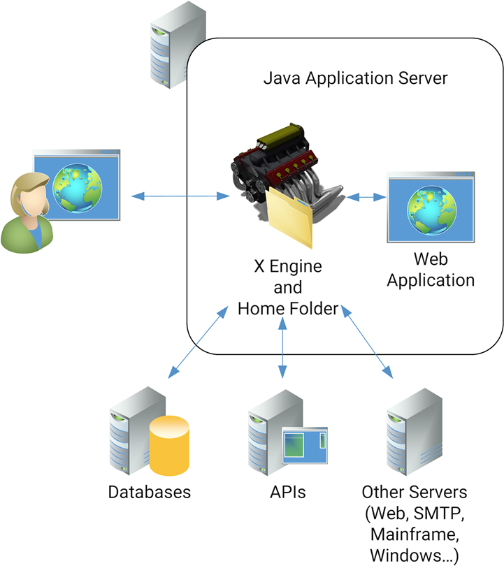 Installing the <code class="expression">space.vars.X\_Agent\_Name\_Single</code> as a Servlet filter in a Java Application Server *(such as Jetty, WebSphere, JBoss etc.)*, is a common approach. In this scenario, the <code class="expression">space.vars.X\_Agent\_Name\_Single</code> is acting like a Servlet Filter sees all requests coming in and has the ability to modify the request before it reaches the web application. Similarly, is also sees every response coming back from the web application and it has the ability to modify these responses on the fly.