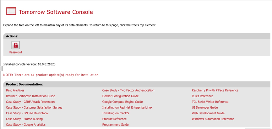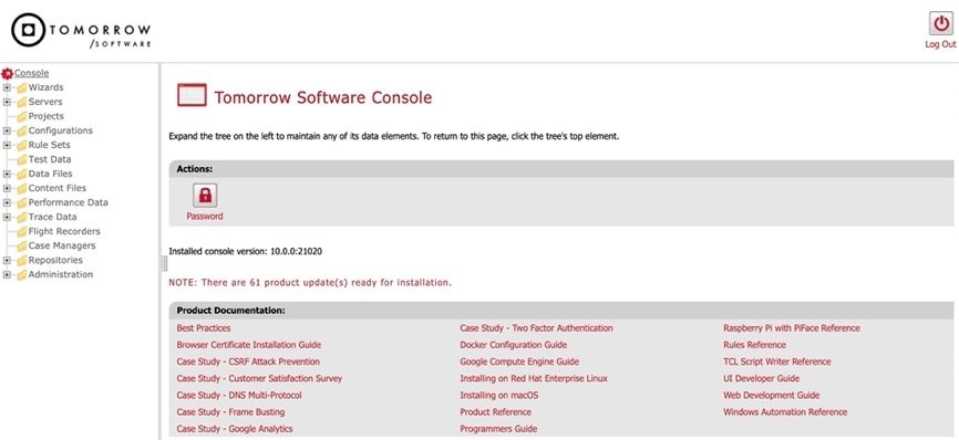 The console is used to administer the system. It is a browser-based application that provides the user with a complete view of all installed servers, rules, configurations and so on. The following is a sample view of the console after the user has logged on.