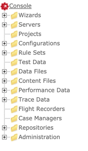The administration tree is used to navigate the console application. To view the properties for a particular function, click the icon or folder in the tree in front of that function. To get back to the main login page, click on Console at the root of the tree. Increase or decrease the vertical space taken up by the tree by dragging the divider left or right.