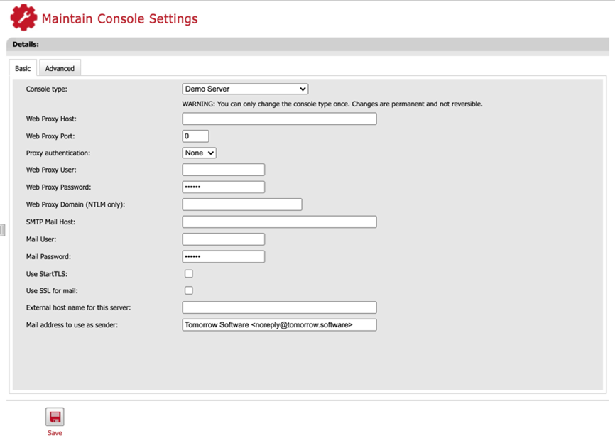 Once you have defined your console type, web proxy and email setup, make sure you click the save button to store the settings. If these settings have been edited, you must restart the console server.