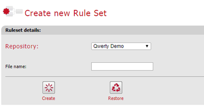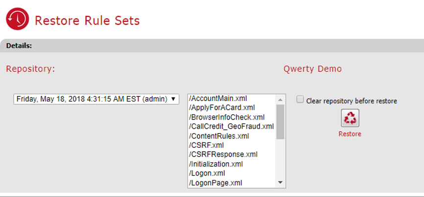 <figure><img src="https://2423451286-files.gitbook.io/~/files/v0/b/gitbook-x-prod.appspot.com/o/spaces%2F42mDa58RoaDxb6t8mbaI%2Fuploads%2Fgit-blob-8d74355004f6eaa4f386b9728776fd70372a4dd7%2Fimage.png?alt=media" alt=""><figcaption><p>Restore Rule Sets</p></figcaption></figure>