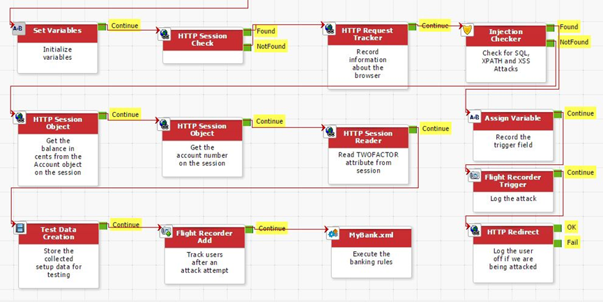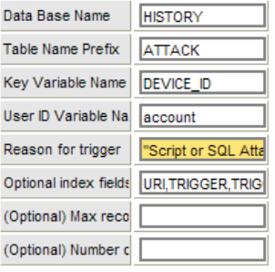 In the above example, all of the data about the particular access to the application has been obtained with the **HTTP Request Tracker**. The next rule is an **Injection Checker** rule that will check all submitted fields for `Java Script, IFRAMEs, SQL` injections etc. Should one be found, a **Flight Recorder Trigger** is invoked, recording the field in which the attack is found, the contents and the URL of where the attack occurred. This data is keyed by `DEVICE_ID` in this case. The full properties for the **Flight Recorder Trigger** are shown below: